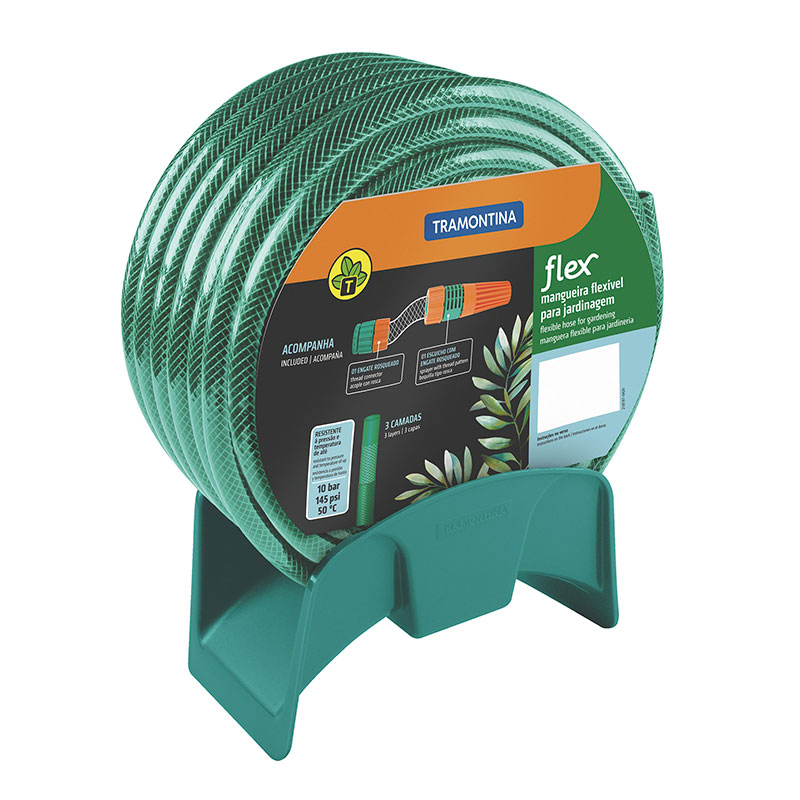 Fabricada en polipropileno de alta resistencia, que proporciona más durabilidad y excelente terminación. El soporte además de colgar la manguera en la manera más correcta ayuda en la organización del espacio. Almacenamiento de hasta 35 metros de manguera de 1/2”.